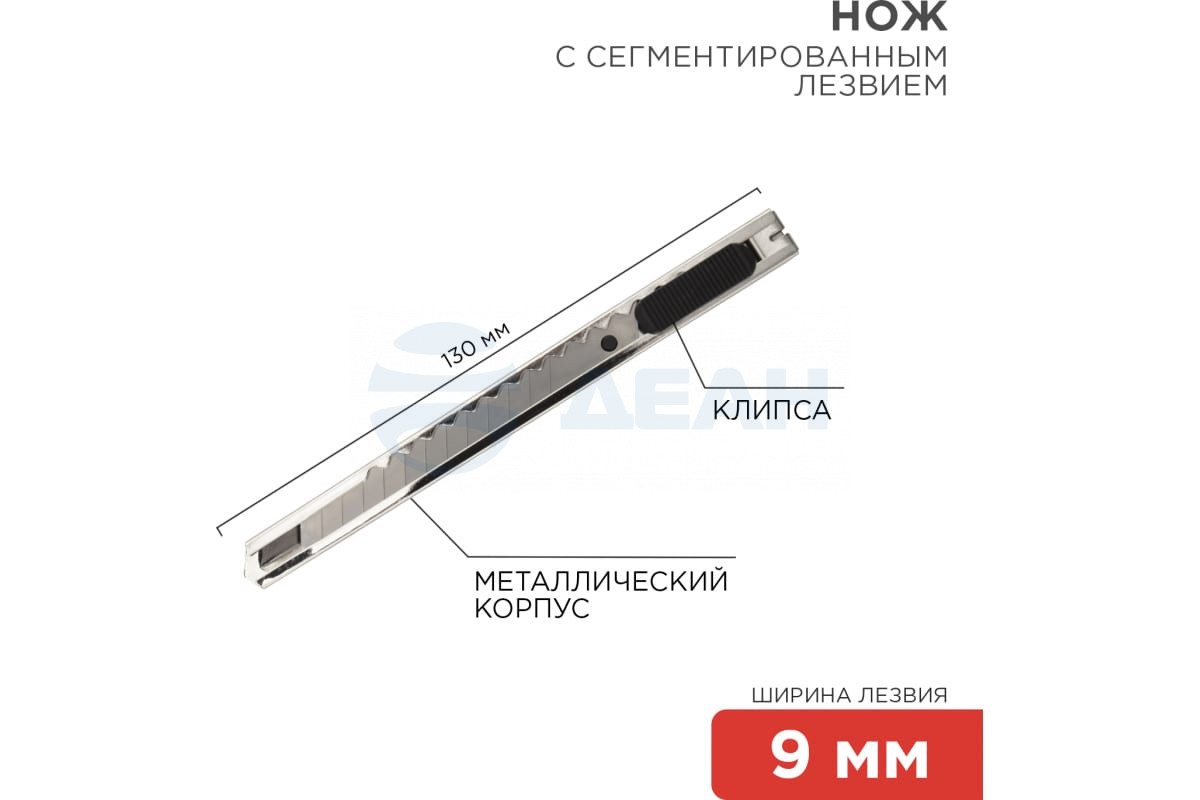Нож с сегментированным лезвием 9мм, корпус металлический, c клипсой REXANT (12-4906)