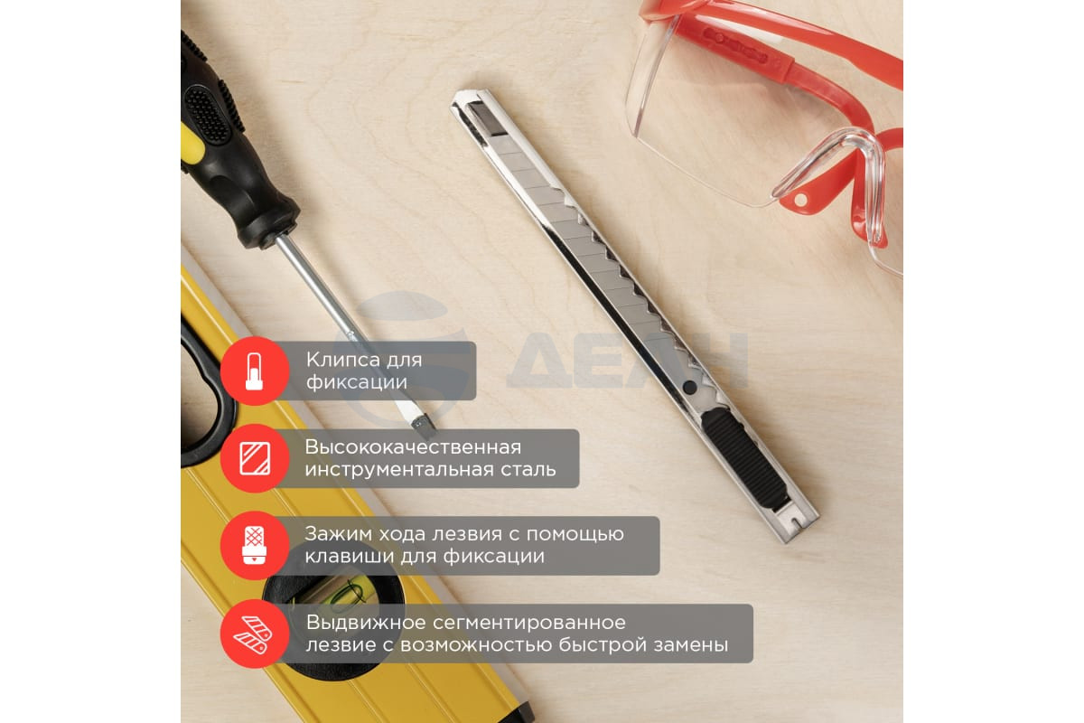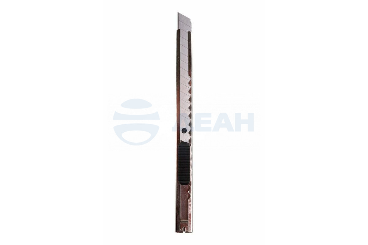 Нож с выдвижным сегментированным отламывающимся лезвием — отличный помощник для разрезания различных материалов: пластика, картона, бумаги. Корпус ножа выполнен из металла и оснащен клипсой, благодаря которой инструмент можно фиксировать на одежде. Сегментированное лезвие шириной 9 мм изготовлено из высококачественной инструментальной стали. Когда крайний сегмент затупляется, его можно отломить и продолжить использовать инструмент. Замена лезвия быстро и просто осуществляется вручную через хвостовую часть ножа.